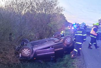 Po nehodě u Chrudimi se auto převrátilo na střechu