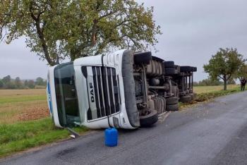 Řidič neudržel tahač s přívěsem na silnici, skončil v příkopu