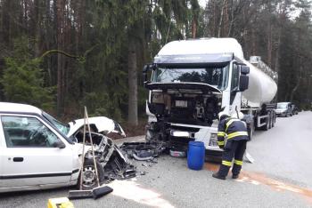 Střet nákladního auta s osobním. Řidička vyvázla se zraněním