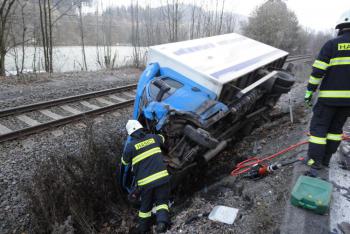 Dodávka narazila do sypače a pak do svodidel. Řidiče museli vyprošťovat.