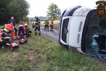 Dodávka skončila na boku a zablokovala cestu, dva zranění