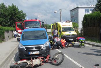 Nehoda autobusu s motocyklem. Štěstí v neštěstí měl motorkář