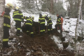 Ve skalách u Bernartic bojují hasiči o život psa. Už je tři dny bez vody a potravy