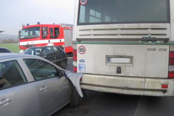 Osobní auto se zaklínilo do autobusu, ke zranění lidí nedošlo