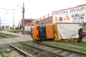 Dodávka v Plzni na kolejích. Převrácená a s malým dítětem uvnitř