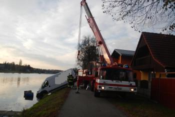 Další podzimní koupel. Hasiči na vyproštění dodávky museli povolat jeřáb