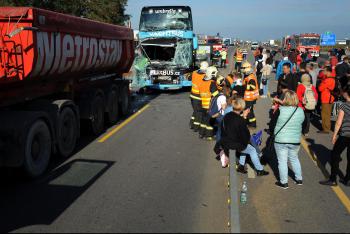 Dva náklaďáci "skříply" autobus a nehoda pak zablokovala příjezd do Prahy po dálnici D8