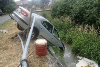 Řidič jízdu nezvládl. Vyprošťování auta z potoka v Třemešné