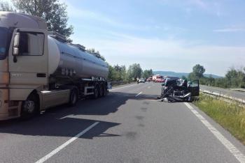 Na dálnici D10 narazil řidič osobního auta do cisterny se žíravinou
