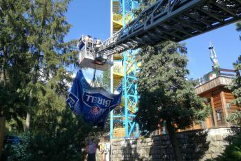 Vítr má asi taky smysl pro humor. Slunečník skončil v koruně stromu
