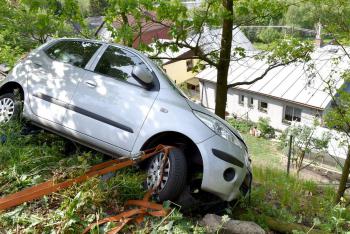 Pozor, auto letí! Vozidlo zůstalo ve srázu nad rodinnými domy