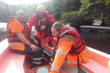 Záchrana po vodě. Hasiči převezli pacientku k ošetření na člunu