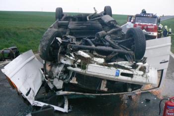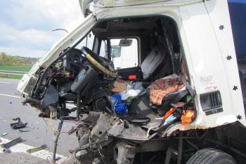 Zdeformovaná kabina náklaďáku po střetu s jiným náklaďákem