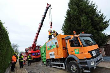 Popeláři měli zpoždění. V pražském Suchdole se jim propadl vůz, vyprostil ho jeřáb
