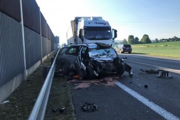 Kolize náklaďáku a dvou osobních vozů urvala motor ze zdemolovaného auta