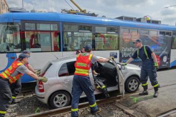 Senior řízení nezvládl. Hasiči vyprostili z kolejí fabii po střetu s tramvají