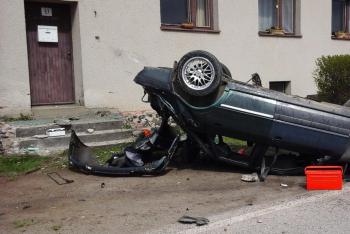 Auto se po nárazu do domu v Ledenicích převrátilo na střechu