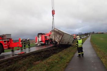 Bizon s jeřábem vyprošťovali nákladní Daewoo z příkopu v Děhylově