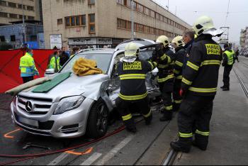 Dopravní nehoda tramvaje a osobního automobilu, v něm zůstal zaklíněný řidič