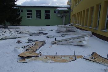Fičák jako hrom. Silný vítr poškodil střechu Základní školy v Adolfovicích