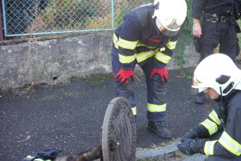 Hasiči vyprošťovali z litinového víka kanálu vysílené a vyděšené zvířátko