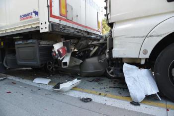 Motorka skončila zaklíněná pod osobním vozidlem, její řidič přežil