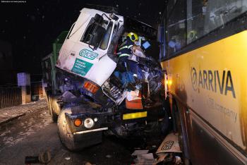 Plný autobus cestujících se v Radotíně srazil s náklaďákem, devět zraněných