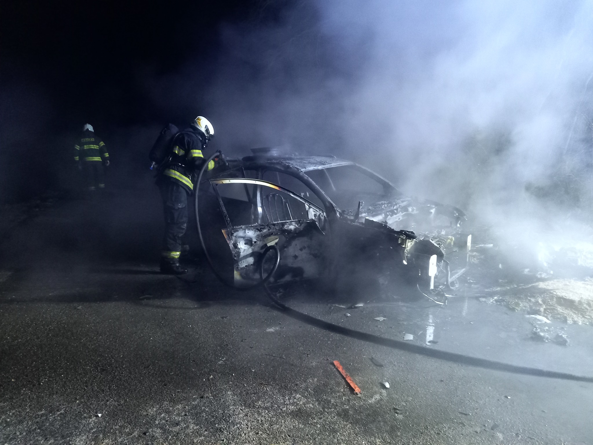 K druhému požáru vyjížděli profesionálové z Nového Bydžova a jejich dobrovolní kolegové z Chlumce nad Cidlinou krátce před půlnocí (foto 3). Ohlašovatel viděl hořící automobil z dálnice a vše ohlásil na tísňové lince. Z vozidla mnoho nezbylo. Vzhledem k tomu, že se však jednalo o odstavený vrak, není vyčíslena škoda. Příčina je také v šetření.