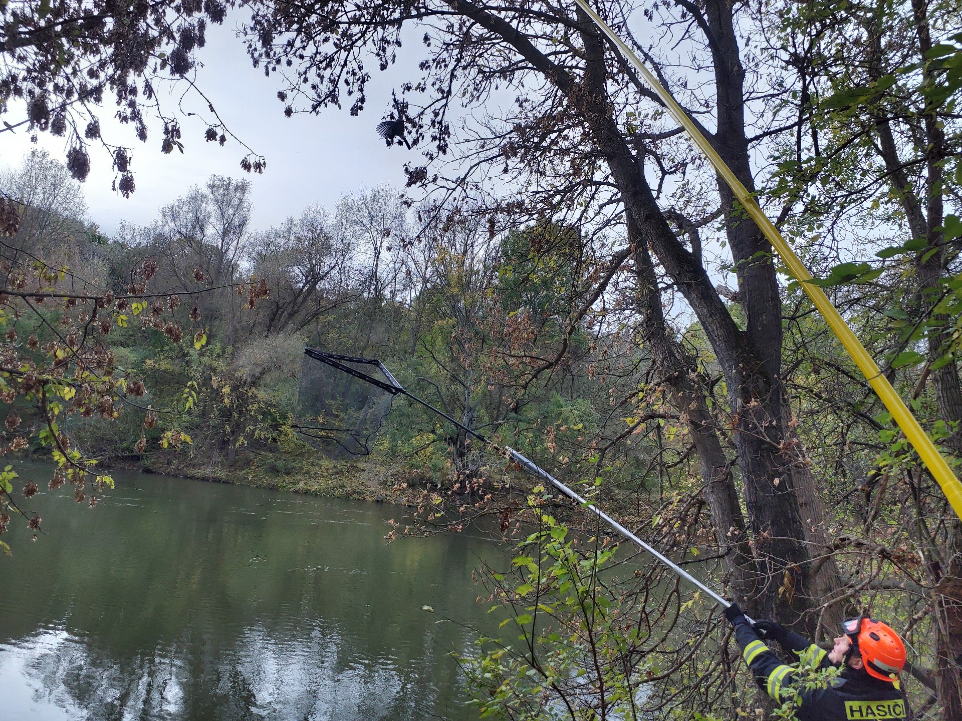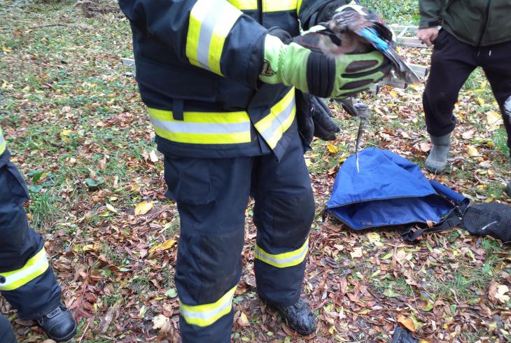 Pomocí rybářského podběráku se hasičům podařilo ptáka bezpečně vyprostit. Zachráněnou sojku poté umístili do rybářského boxu.