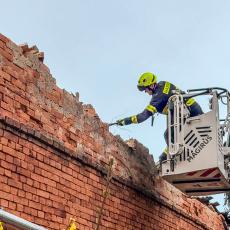 Pro bezpečnost hasiči provedli odstranění nebezpečné štítové zdi, za pomocí výškové techniky.