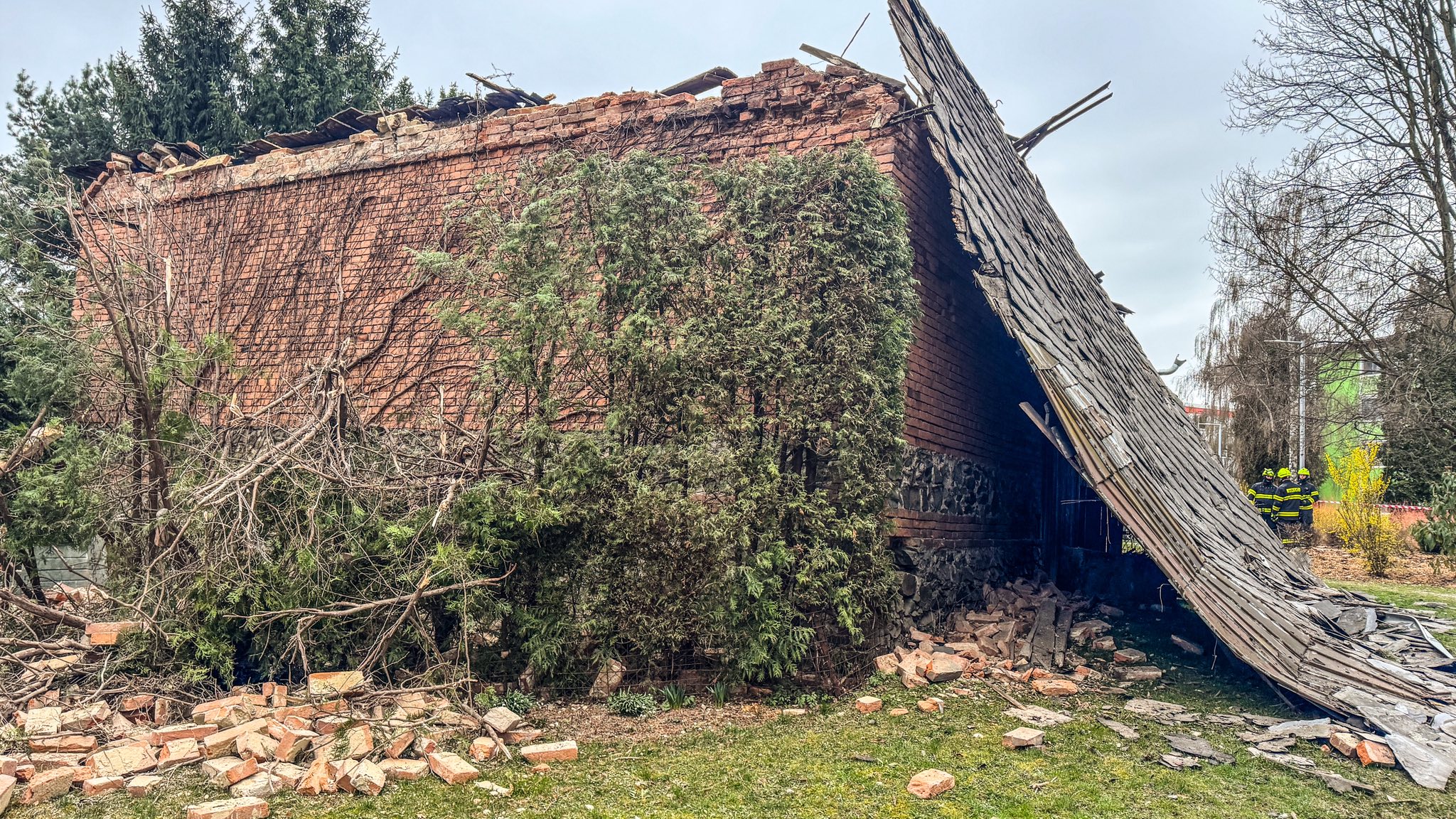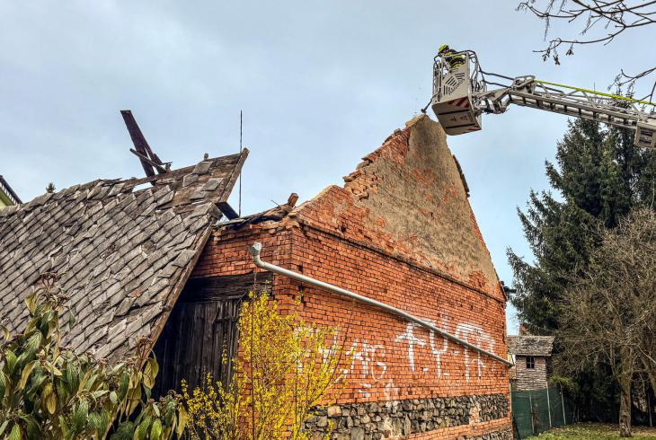 Došlo k pádu jedné štítové zdi a sesunutí střechy na část chodníku.