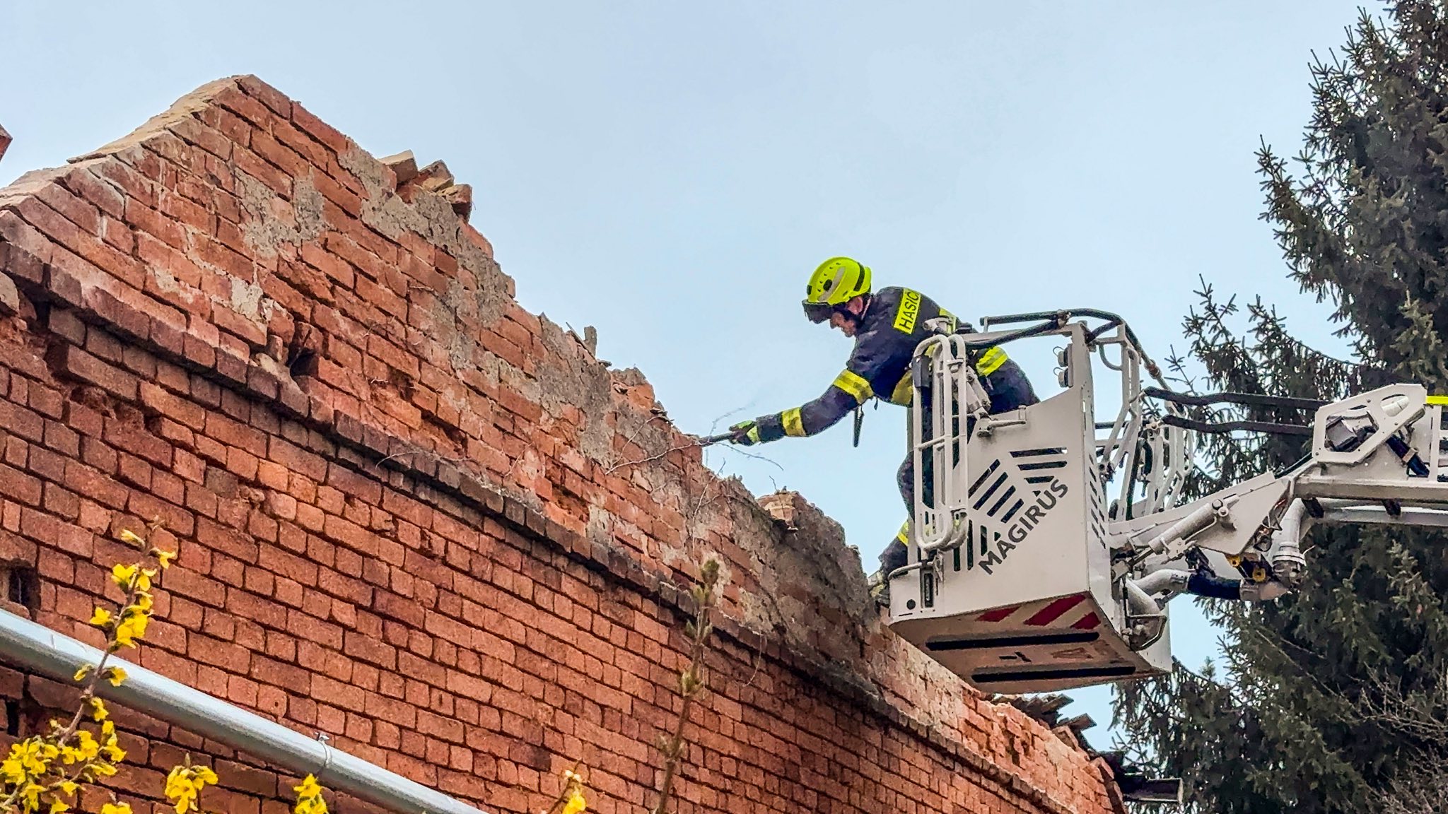 Pro bezpečnost hasiči provedli odstranění nebezpečné štítové zdi, za pomocí výškové techniky.