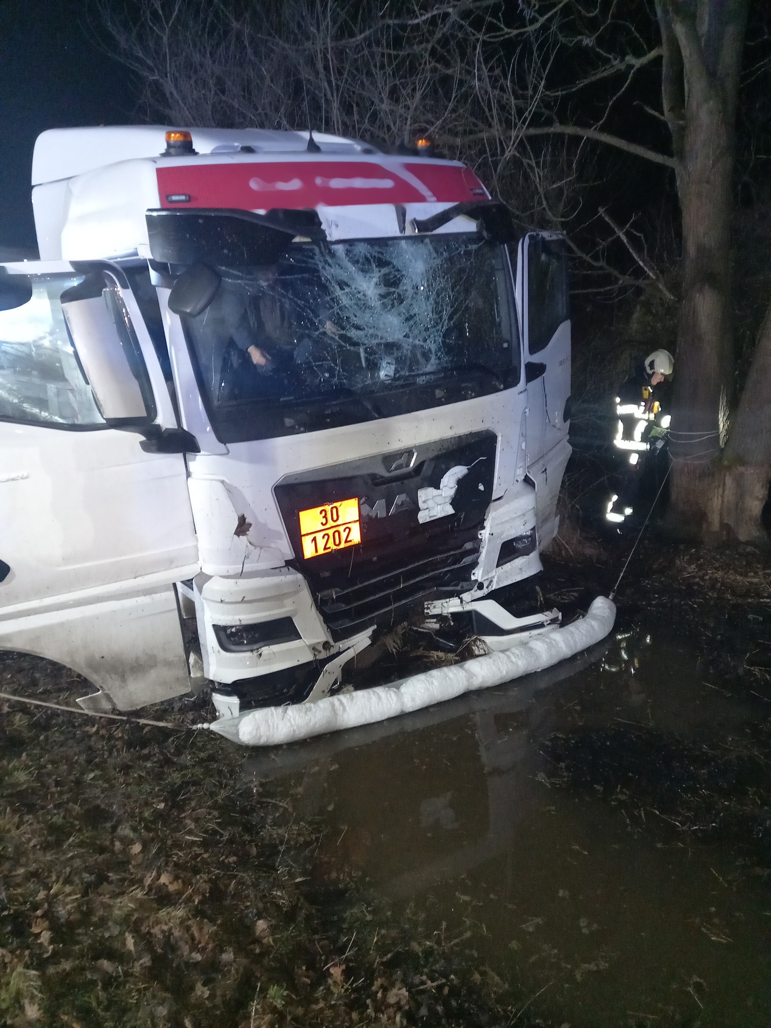 Nezraněný řidič byl již mimo vozidlo a zasahujícím hasičům sdělil, že cisterna nepřeváží pohonné hmoty, ale je prázdná. Hasiči kontrolou vozidla zjistili únik převodového oleje a na jeho jímání použili sorpční hady.