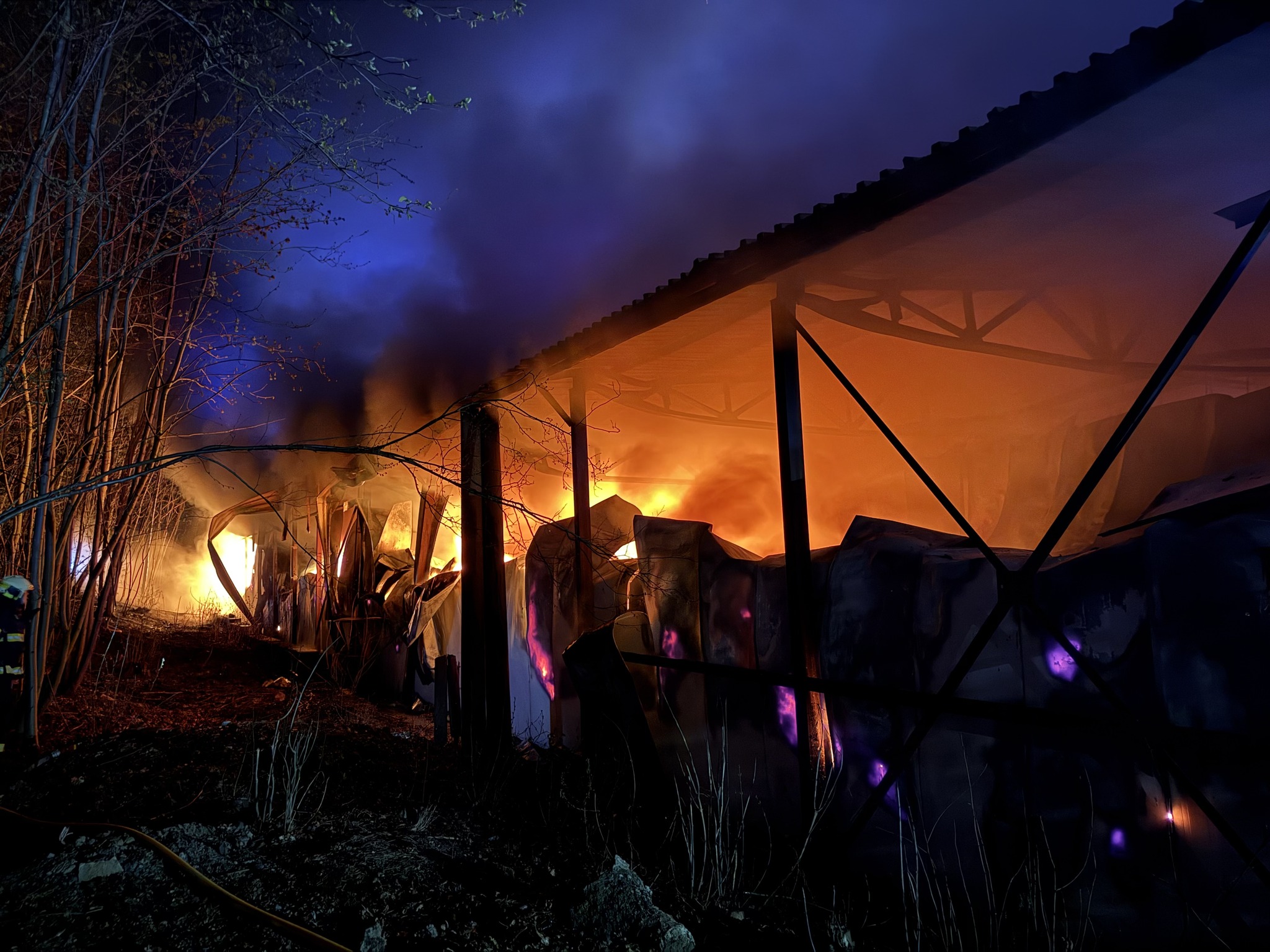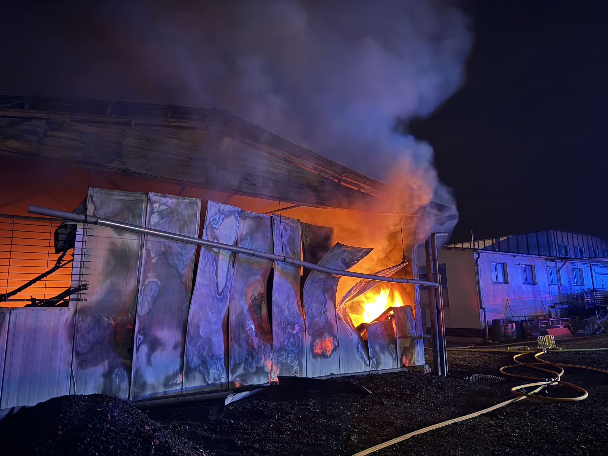Po příjezdu prvních jednotek byly patrné plameny a hustý kouř. Požár zasáhl halu o rozměrech přibližně 55 × 20 metrů. K jeho likvidaci bylo nasazeno devět vodních proudů, zásah probíhal z vnější strany objektu ze země i za využití výškové techniky.