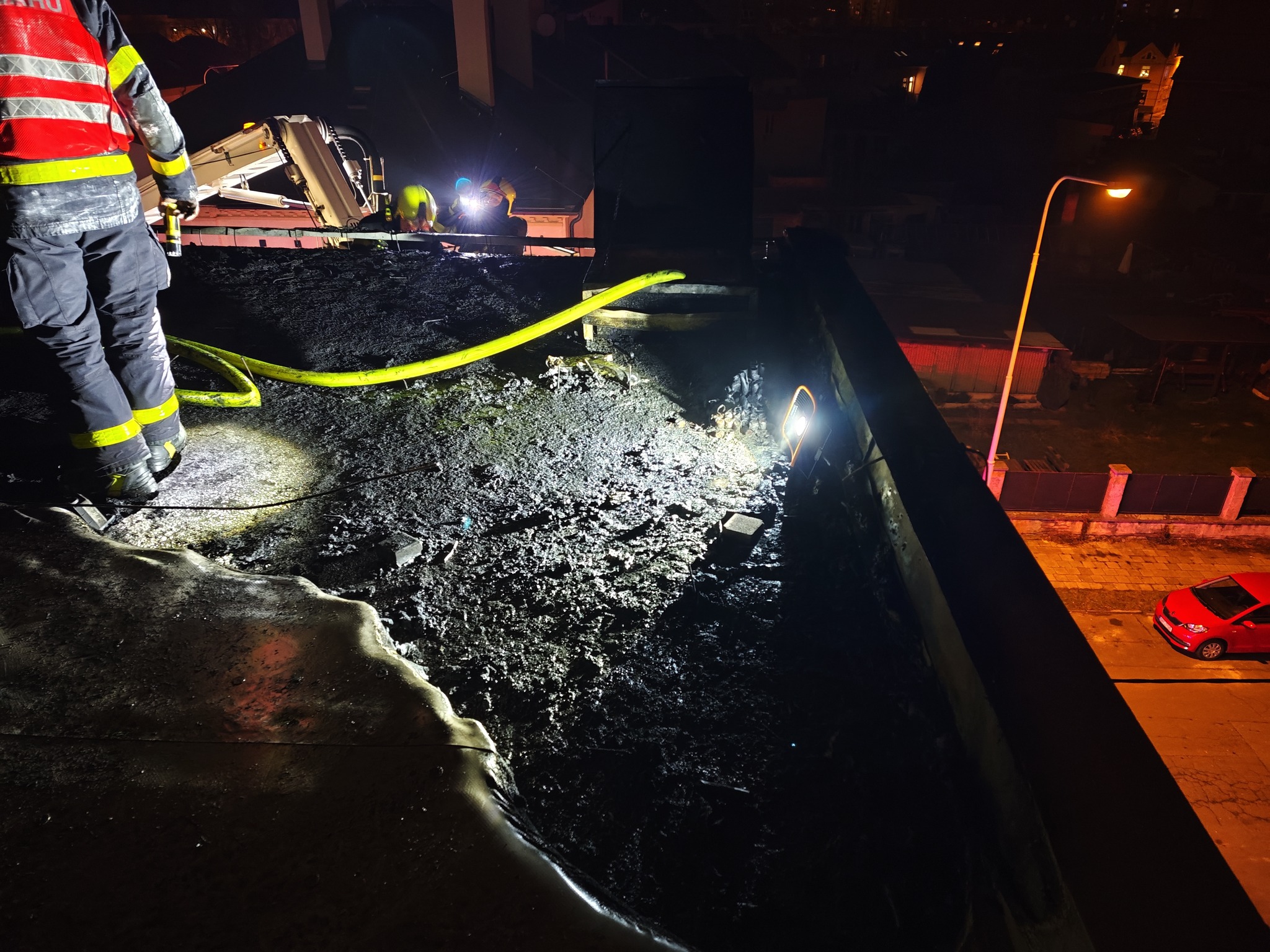 Dle prvotních informací došlo ke vzniku požáru při odpalování zábavní pyrotechniky na střeše objektu. Hasiči okamžitě po příjezdu zahájili hasební práce, které probíhaly také za využití výškové techniky. Požár, který zasáhl přibližně 20 m2 střechy, byl lokalizován během 15 minut, následně byl další dvě hodiny dohašován, přičemž hasiči vyhledávali také skrytá ohniska požáru.