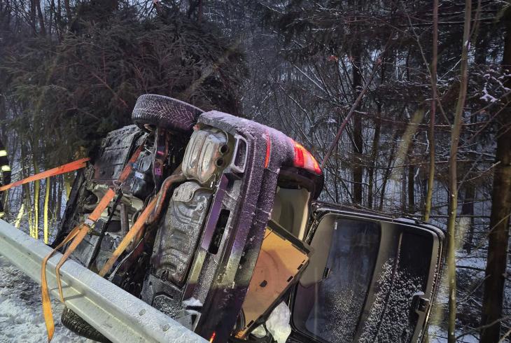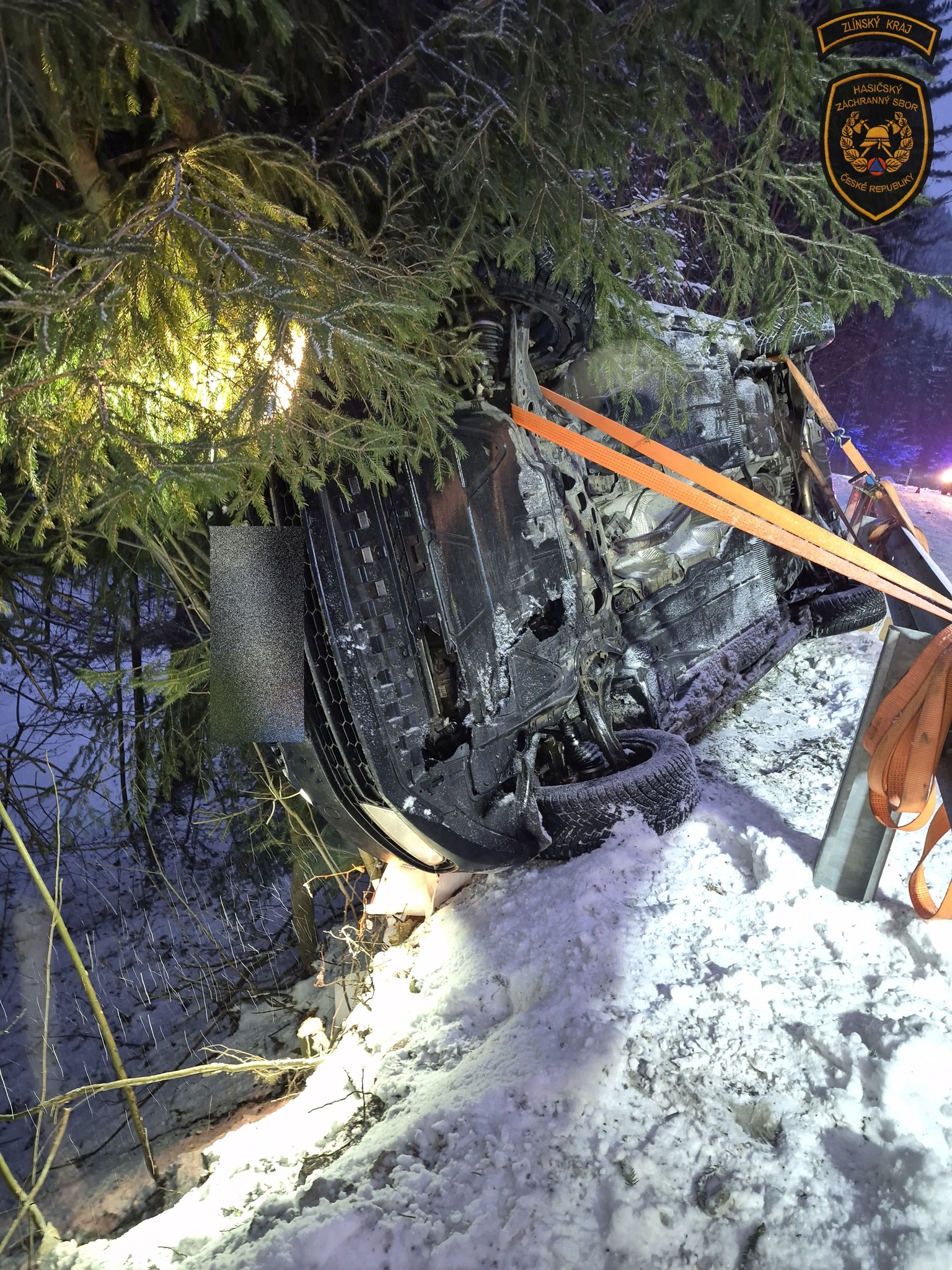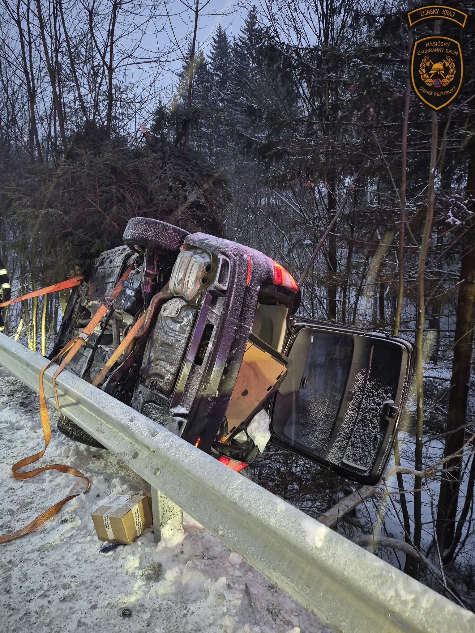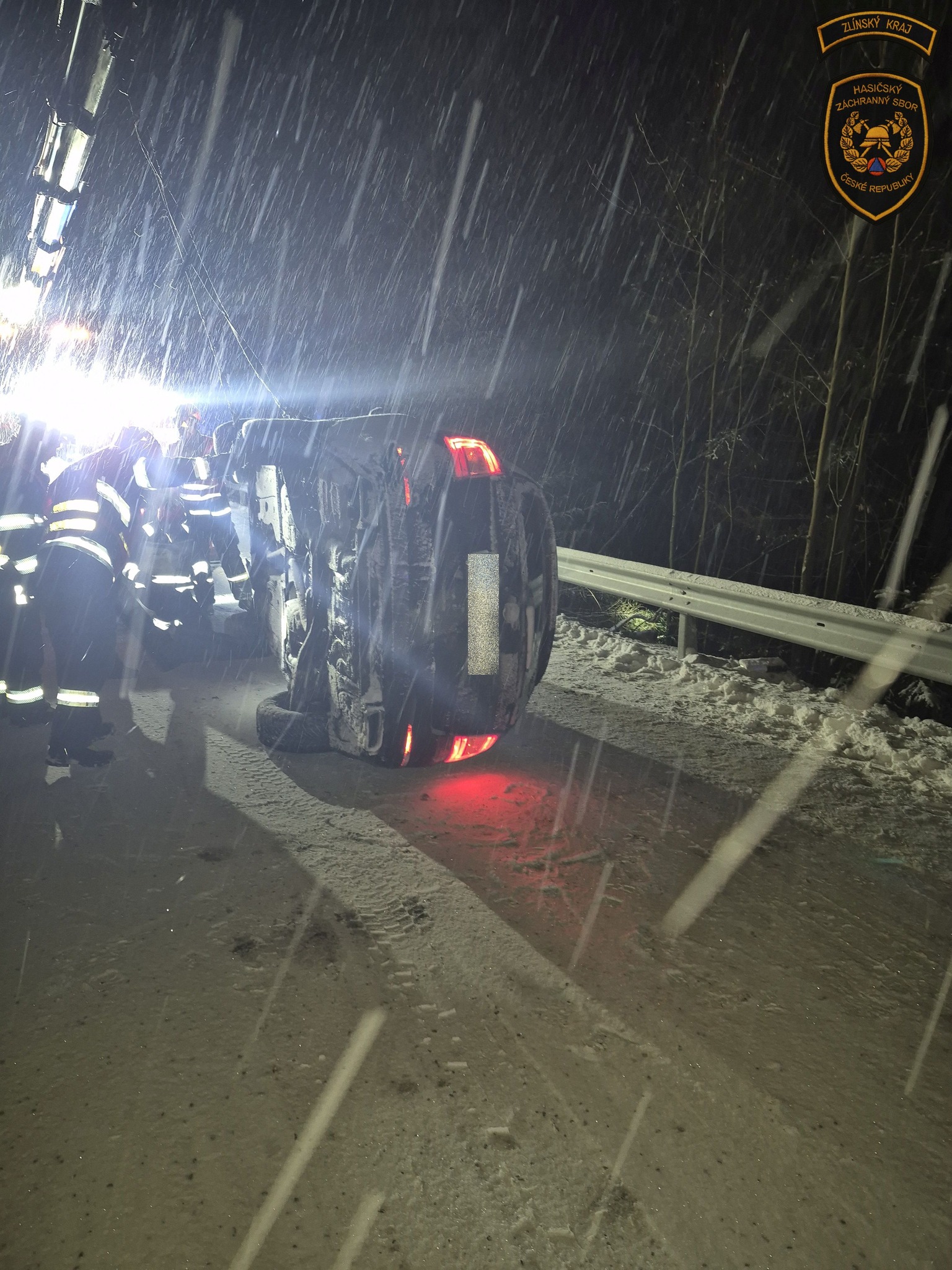 Řidič osobního vozidla zde vyjel mimo komunikaci a s automobilem skončil na boku vedle silnice za svodidly. Ve vozidle cestovaly čtyři osoby. Dvě z nich utrpěly zranění a byly předány do péče posádky zdravotnické záchranné služby.