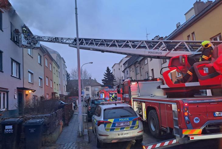 Před sedmou hodinou ranní vyjížděli hasiči ze stanic Líšeň a Lidická k požáru bytu v třípodlažním domě. První jednotka byla na místě do pěti minut od ohlášení a proti plamenům nasadila dva vodní proudy.
