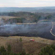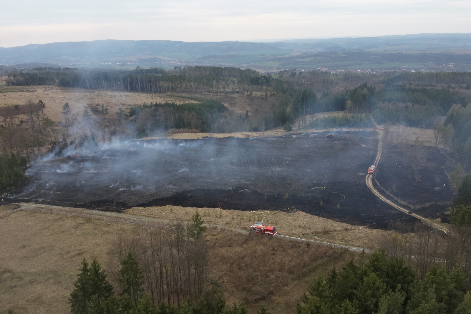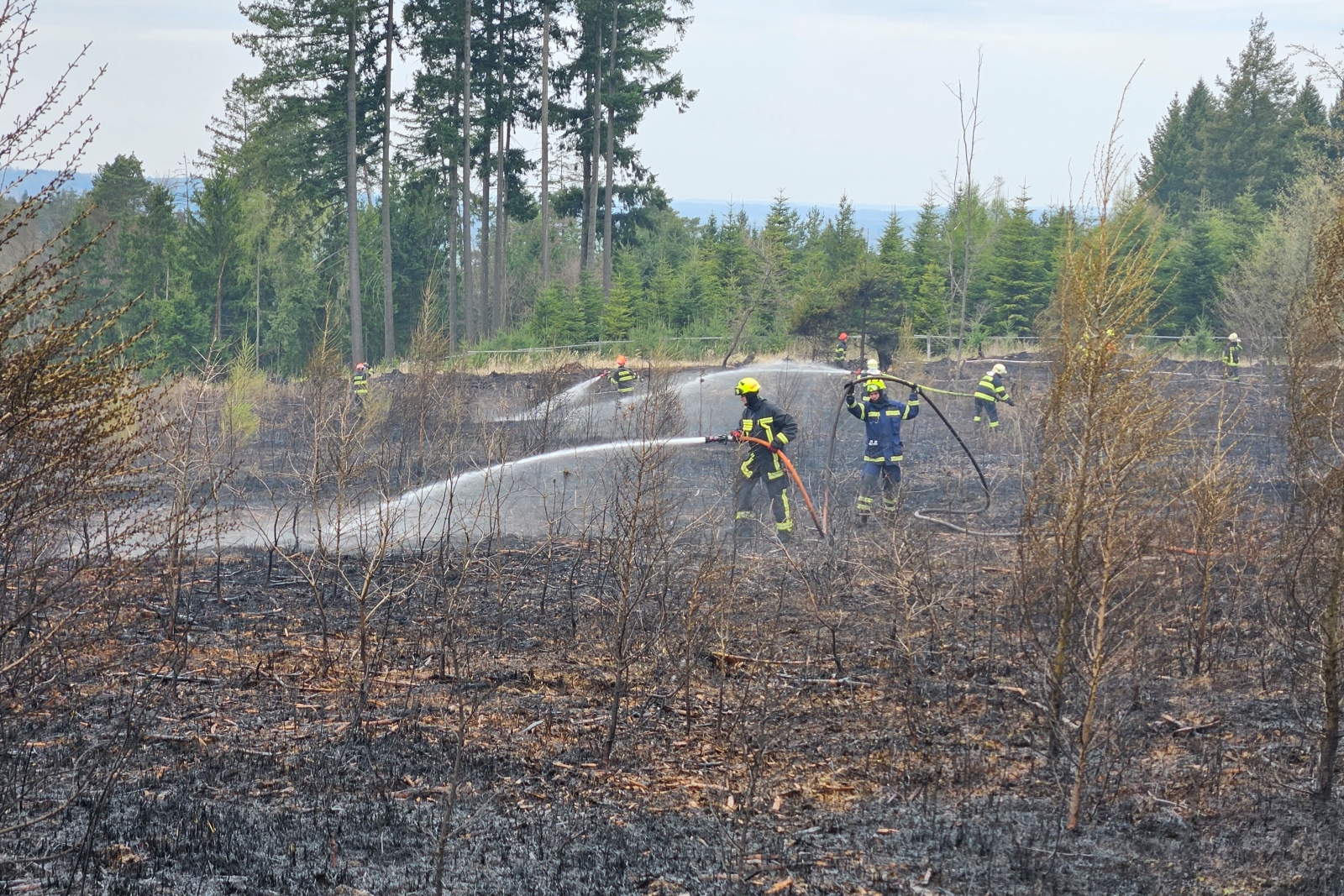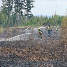 Po šestnácti minutách se hasiči lesními cestami dostali k plamenům a začali hasit několik oplocenek s mladým lesem. Před třináctou hodinou byl vyhlášen třetí stupeň požárního poplachu.