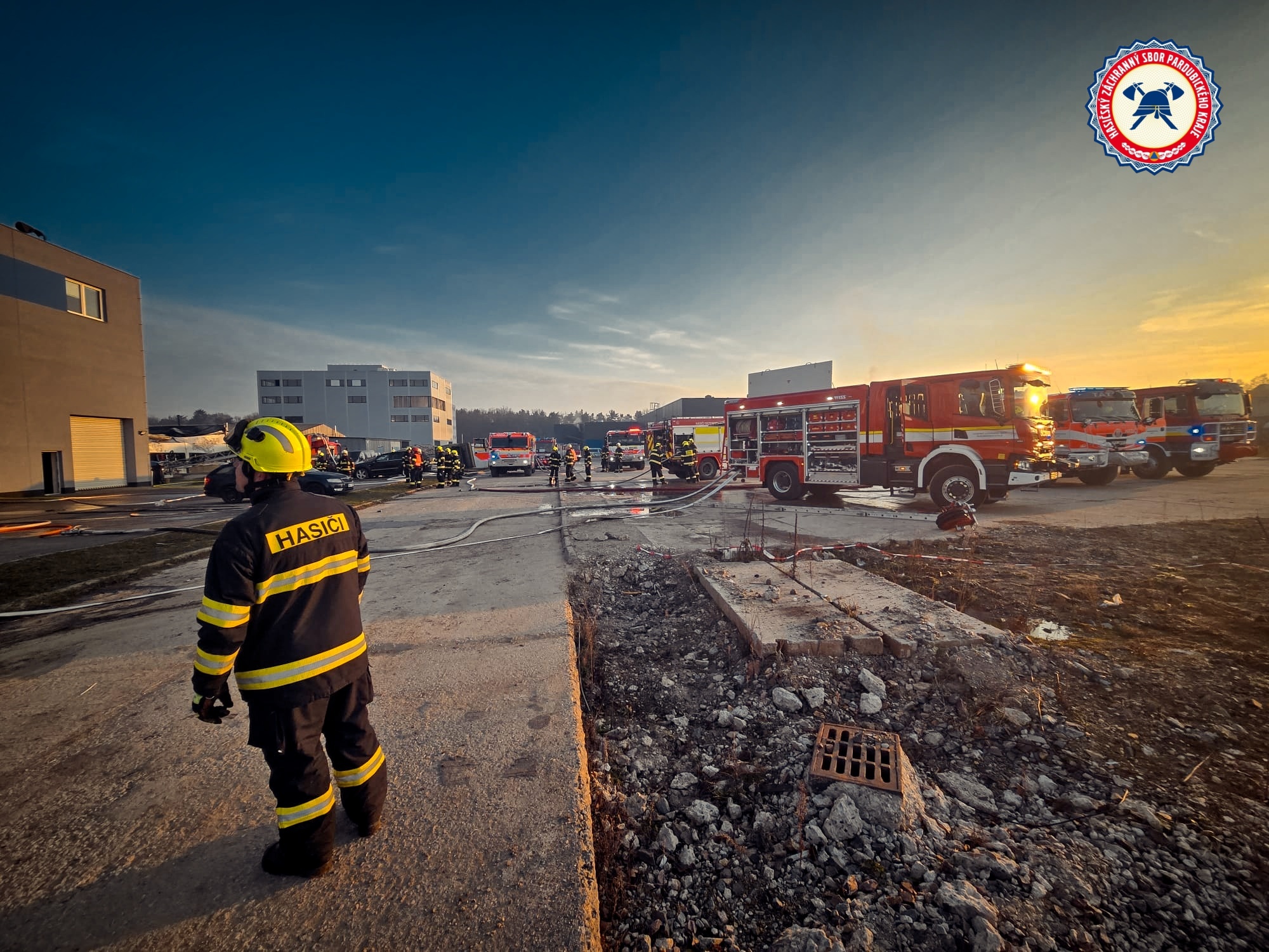 Při příjezdu hasičů a prvotním průzkumu bylo zjištěno, že došlo k požáru skladovací haly a administrativní budovy, kam se požár rozšířil. Z důvodu dopravy hasební vody byly zřízeny dvě čerpací stanoviště v Černé za Bory a v Pardubicích, křižovatka ul. Dělnická a Průmyslová.